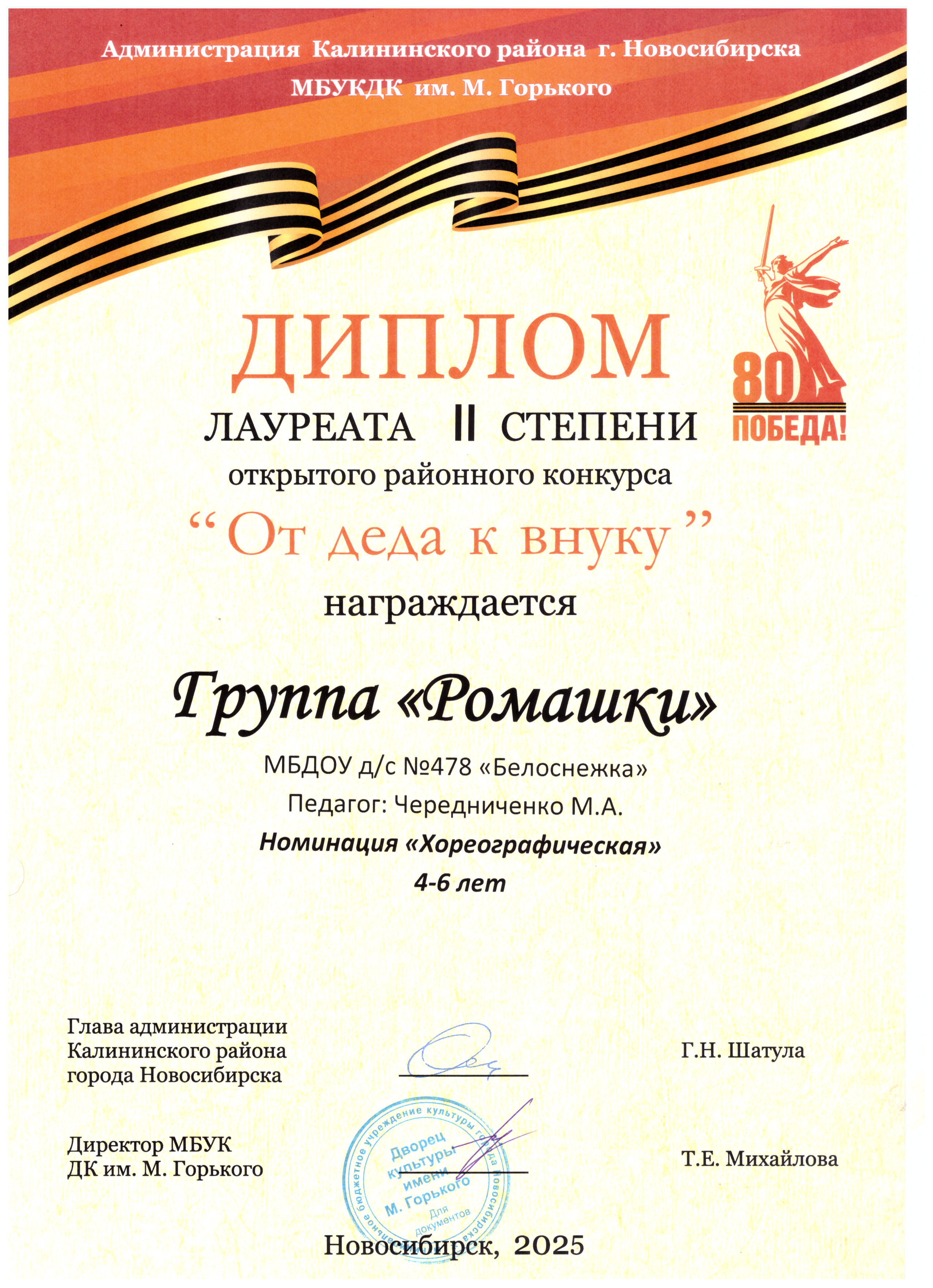 Диплом лауреата 2 степени открытого районного конкурса "От деда к внуку", номинация хореография, 9 группа. 30.04.2025г.