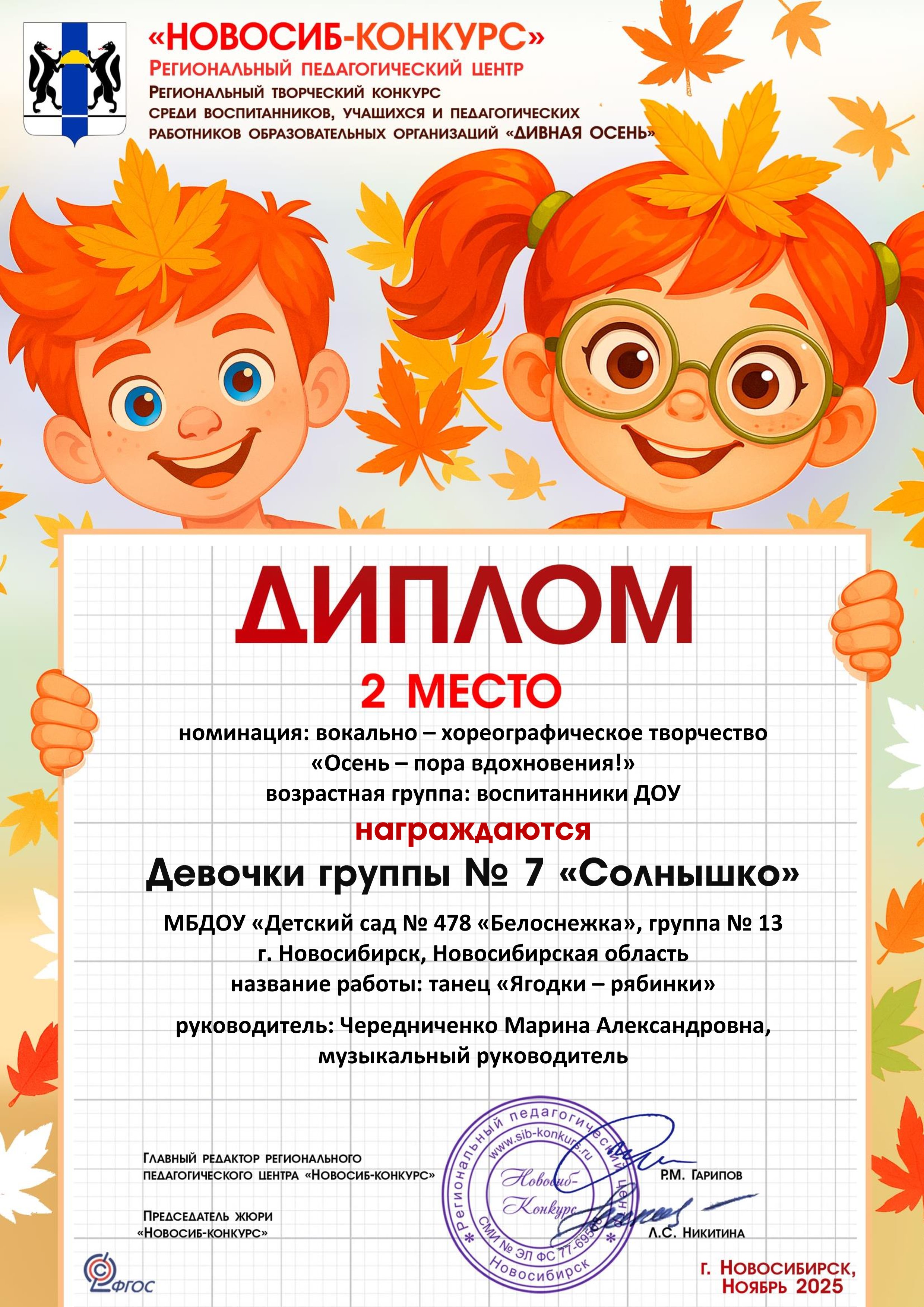 Диплом 2 место региональный творческий конкурс среди воспитанников "Дивная осень", девочки гр.7 "Солнышко", 17.11.2025г.