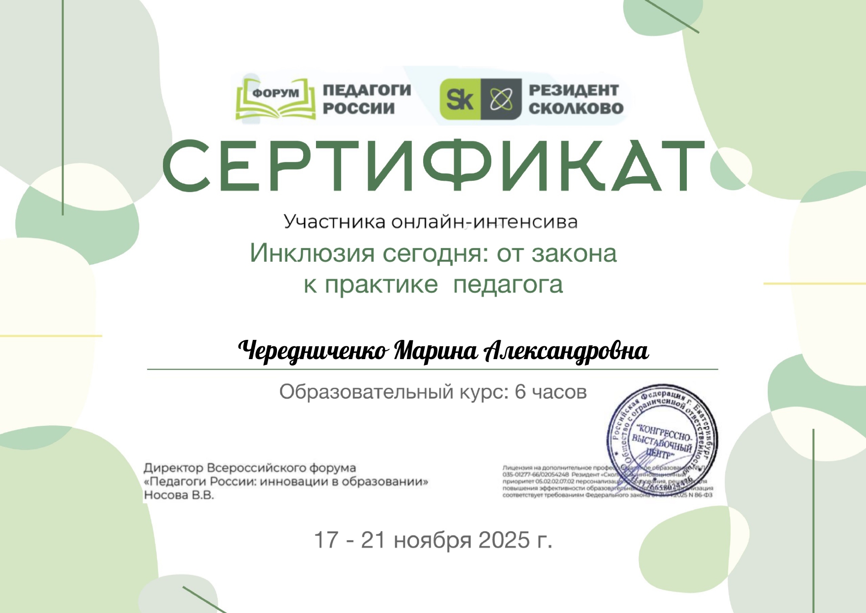 Сертификат участника онлайн-интенсива "Инклюзия сегодня: от закона к практике педагога", Всероссийский форум "Педагоги России: инновации в образовании", 6 часов, 17.11.25г.