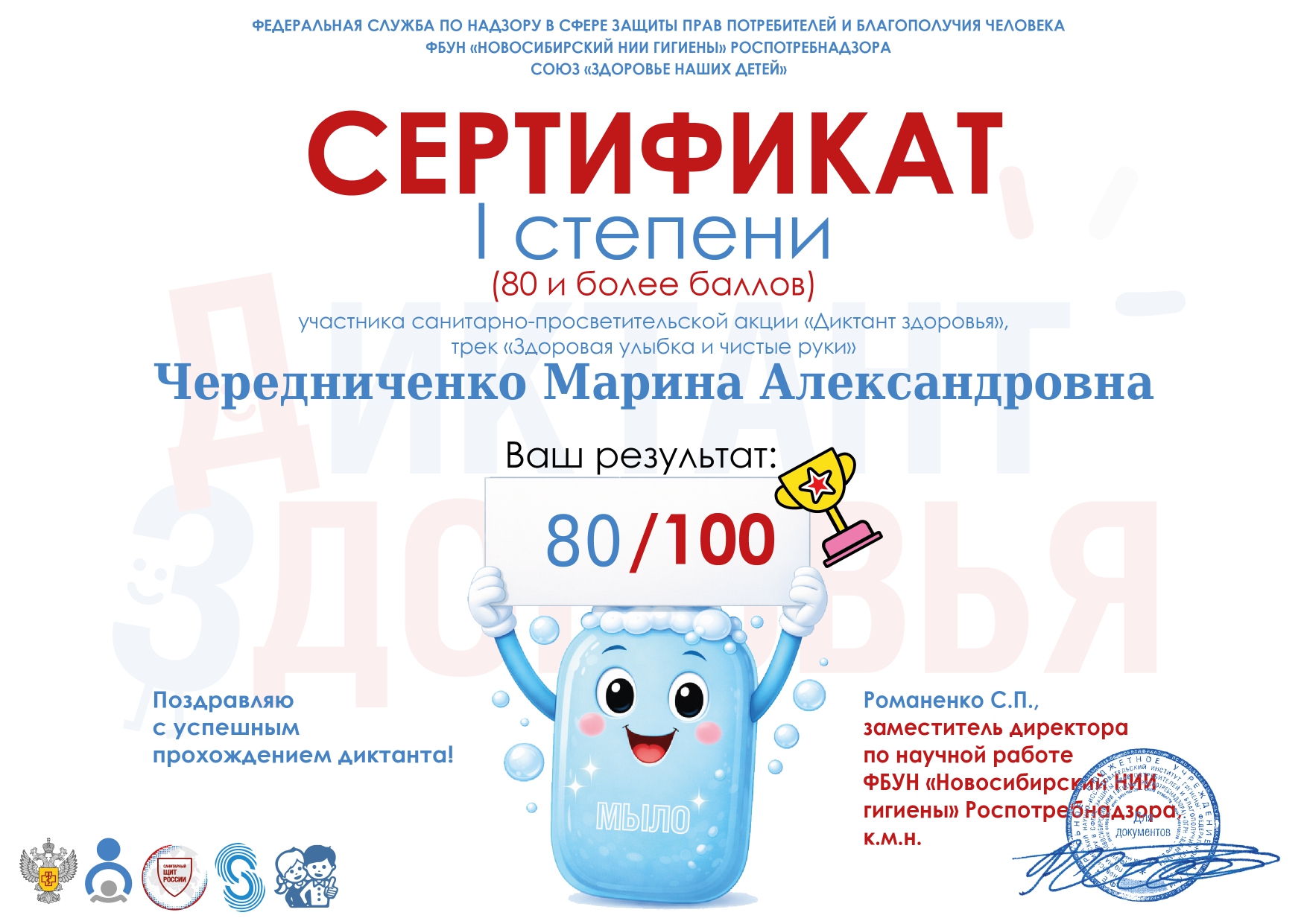 Сертификат участника просветительской акции "Диктант здоровья", 14.04.2026г.