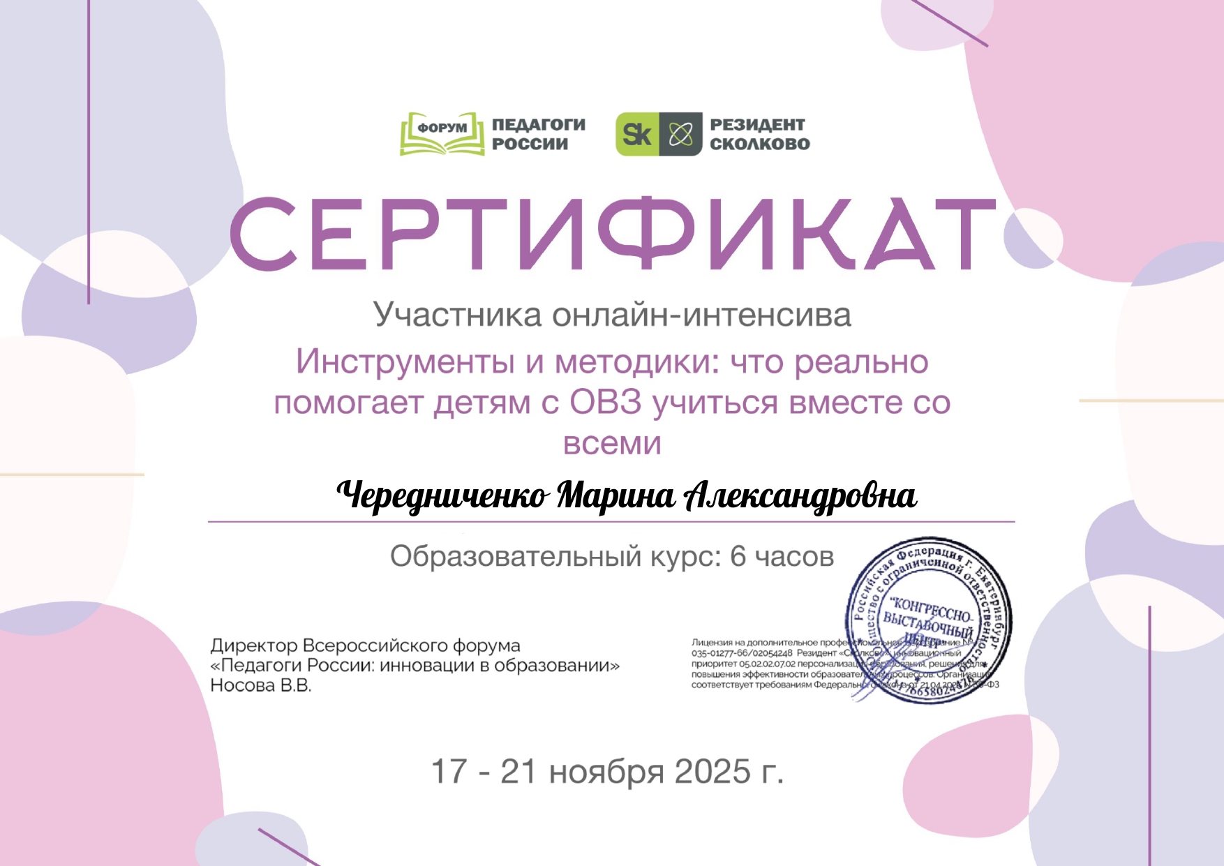 Диплом участника онлайн-интенсива "Психолого-педагогическое сопровождение обучающихся с ОВЗ в условиях инклюзивного образования", Всероссийский форум "Педагоги России: инновации в образовании", 6 часов, 17-21.11.25г.