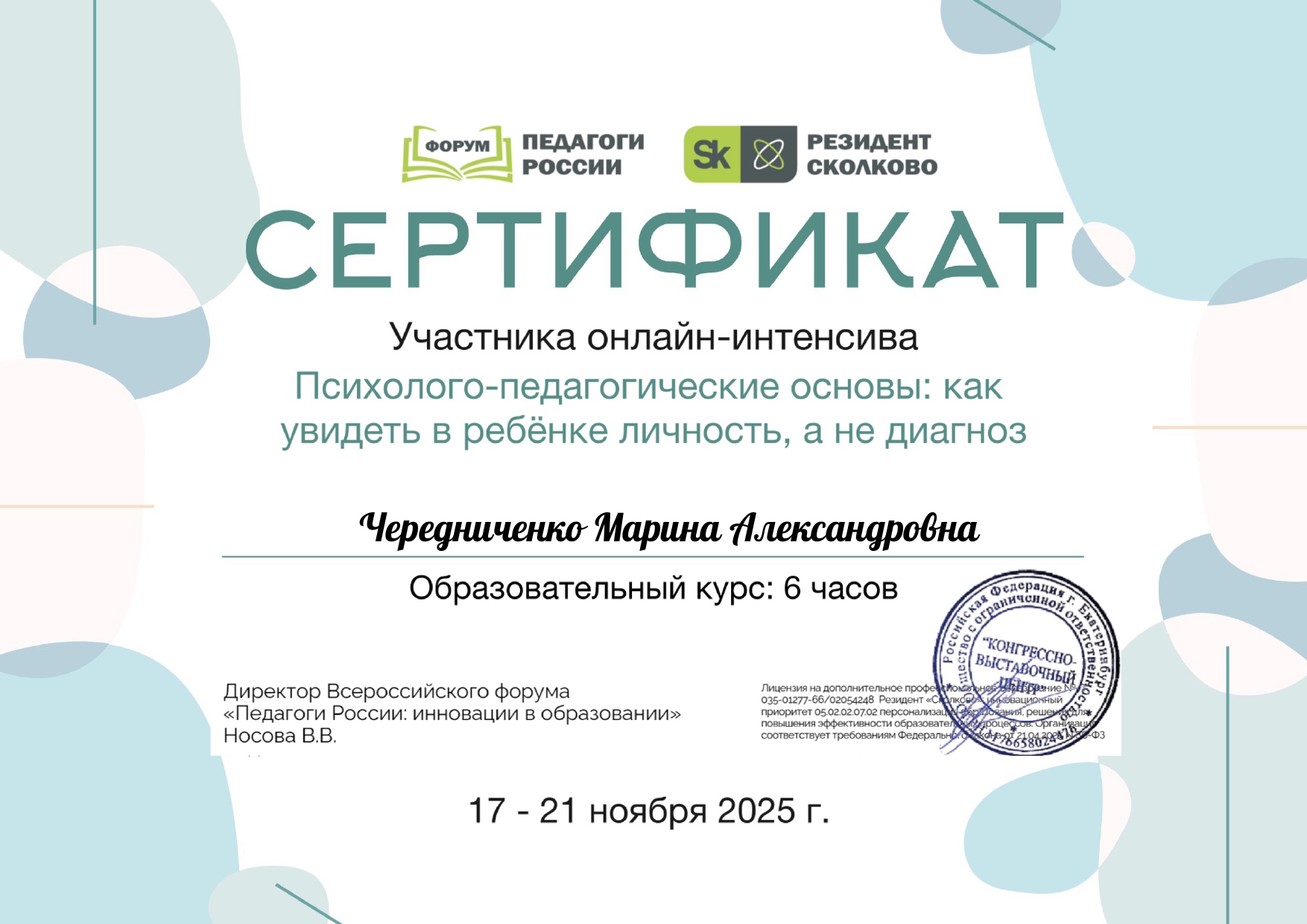 Сертификат участника онлайн-интенсива "Психолого-педагогические основы: как увидеть в ребенке личность, а не диагноз" ", Всероссийский форум "Педагоги России: инновации в образовании", 6 часов, 17.11.25г.